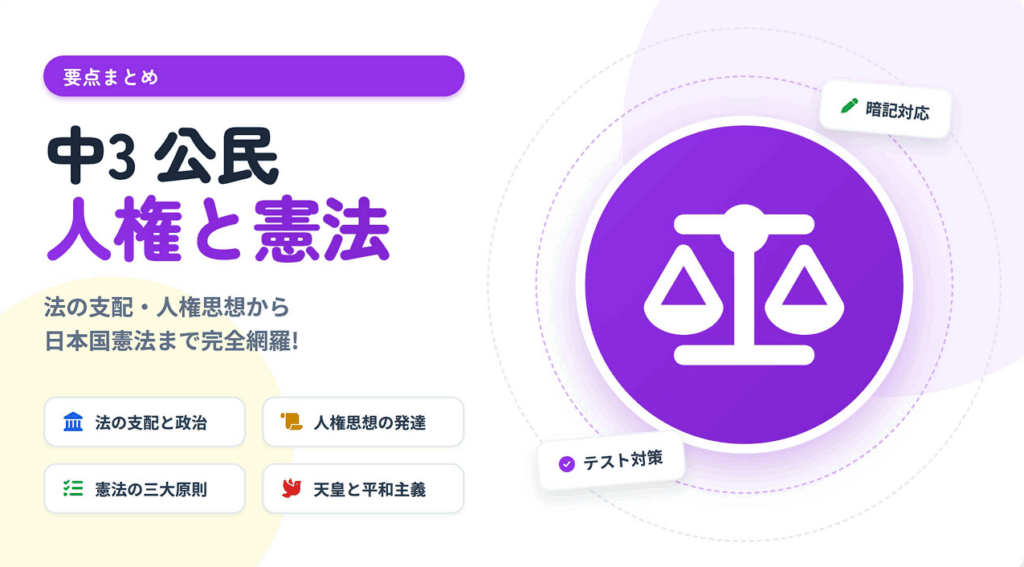 中3 公民:人権と日本国憲法 中3 公民:人権と日本国憲法 詰める 区切る 🔲 タイトル 暗記 解答 白黒へ 印刷 中3 公民:人権思想の発達と日本国憲法 中学3年 公民 2025年度版 1. 民主政治のはたらき 🏛️ 政治と法の支配 政治:利害の調整、秩序の維持。 法...