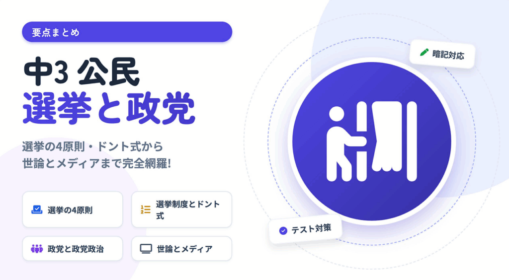 中3 公民:選挙と政党 中3 公民:選挙と政党 詰める 区切る 🔲 タイトル 暗記 解答 白黒へ 印刷 中3 公民:選挙と政党 中学3年 公民 2025年度版 1. 政治参加の方法 🗳️ 民主主義とは :多くの人々で物事を決めようという考え方。 ⇔ 政治(一人や少数が決め... -