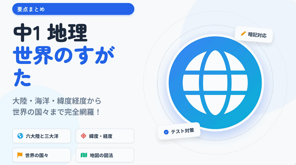 中1 地理:世界のすがた 詰める 区切る 🔲 タイトル 暗記 解答 白黒へ 印刷 中1 地理:世界のすがた 中学1年 社会 2025年度版 1. 地球のすがた 🌍 六大陸と三大洋 陸地 : 海洋 地球の別名 大陸 (面積の広い順) 大陸 大陸 大陸 大陸 大陸 大陸 三大洋 (面積... -
