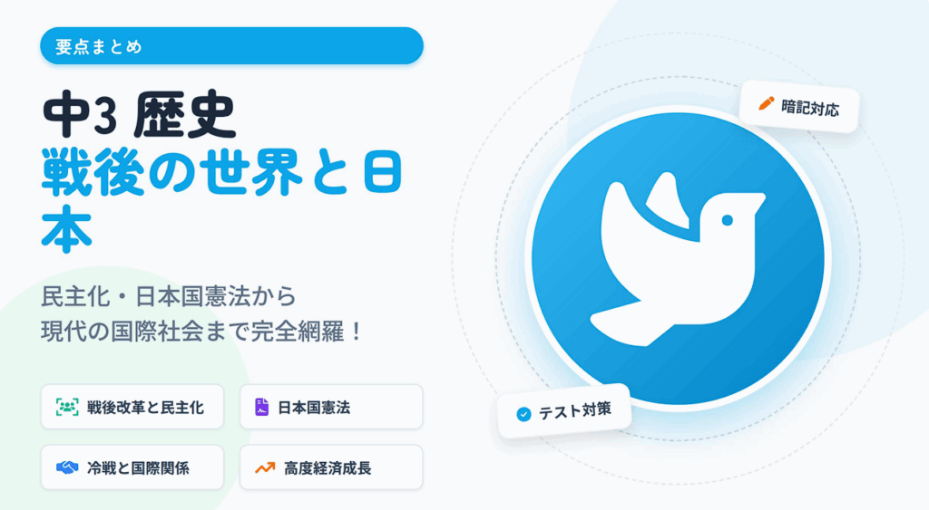 中3 歴史:戦後の世界と日本 詰める 区切る 🔲 タイトル 暗記 解答 白黒へ 印刷 中3 歴史:戦後の世界と日本 民主化から現代まで 1. 戦後の民主化政策 🕊️ 占領下の日本 1945年 受諾・降伏。 (連合国軍最高司令官総司令部)の指令で政治を行う。 最高司令官:... -