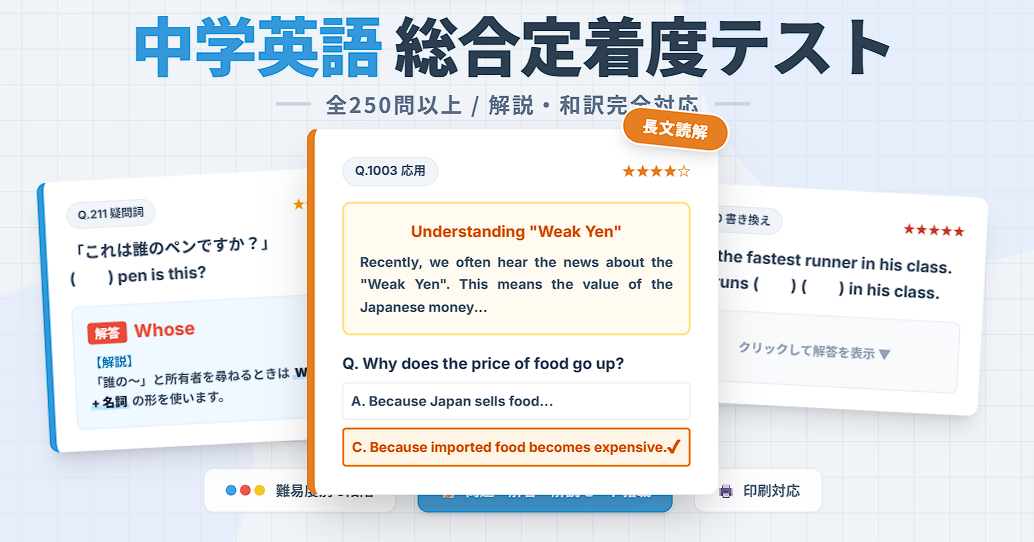 中学英語 総合定着度テスト 中二まで 2025 11/22 中学2年 英語 2025年11月22日 中学英語 総合定着度テスト (解説・和訳完全版) 中学英語 総合定着度テスト 全範囲網羅:中1基礎 ~ 中3発展(現在完了・構文)まで 全250問以上収録・詳細解説・全問和訳付き 問題モード 解答モード 解説モード 印刷レイアウト 中学2年 英語 よかったらシェアしてね! URLをコピーしました! URLをコピーしました! 中3 公民:国際政治・国際経済 資料問題① この記事を書いた人 Mr.ガジェット 旧ブログ『Mr.ガジェットの日記』をBloggerで立ち上げ、その後当ブログ『ミスターガジェット』を創設。 Twitterのフォロワーは2500人を突破。 紅白出場経験のあるミリオンシンガー小野正利氏に師事するなど音楽活動にも力をいれている。 関連記事 比較・最上級 2025年12月11日 中2 歴史:第一次大戦と大正デモクラシー 2025年11月21日 中2 歴史:日清・日露戦争と近代産業 2025年11月21日 中2 歴史:自由民権運動と憲法 2025年11月21日 中2 歴史:明治維新 2025年11月21日 中2 歴史:江戸時代④ 幕末・開国 2025年11月21日 中2 歴史:近代ヨーロッパ 2025年11月21日 中2 歴史:江戸時代③ 改革と文化 2025年11月21日 コメント コメントする コメントをキャンセルコメント ※ 名前 ※ メール ※ サイト 次回のコメントで使用するためブラウザーに自分の名前、メールアドレス、サイトを保存する。